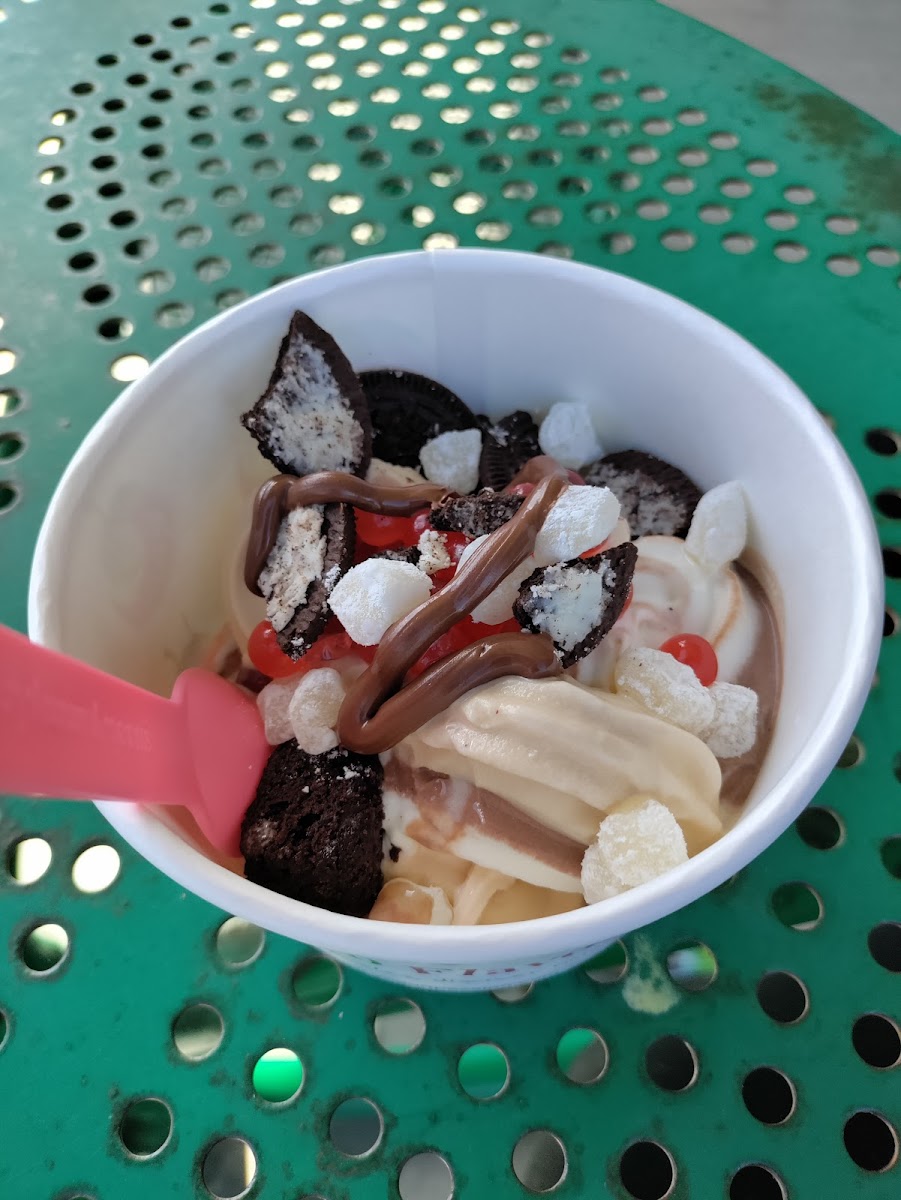 An interesting frozen yogurt bar with a wide selection of flavors and toppings. You pay 73¢/lb which works out to be expensive, however you have full control of the flavors, toppings, and portions.